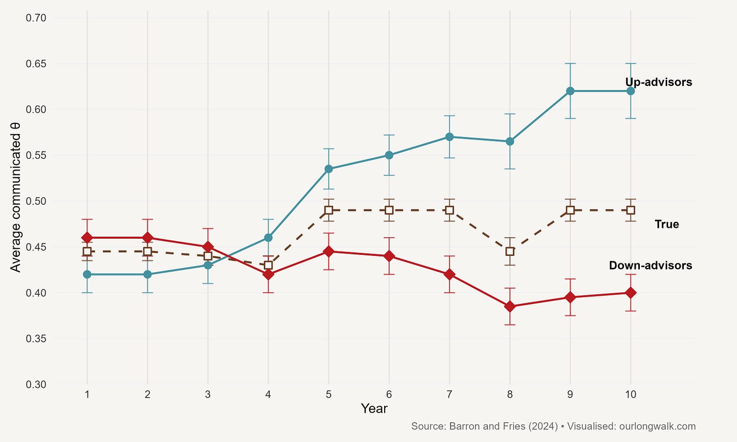 That is what the economists Kai Barron and Tilman Fries set out to test.1 They asked financial advisers to explain identical company data to potential investors. One adviser was told to tell a positive story. She said that a new chief executive had taken over in year three and that this change explained the improvement since then. The investor who heard her version saw a comeback story, a firm rediscovering its footing. Another adviser, asked to be negative, said the opposite: that a new CEO, appointed in year six, meant a decline in fortunes. The data remained unchanged, but the story did not. And so did the decision about whether to invest.