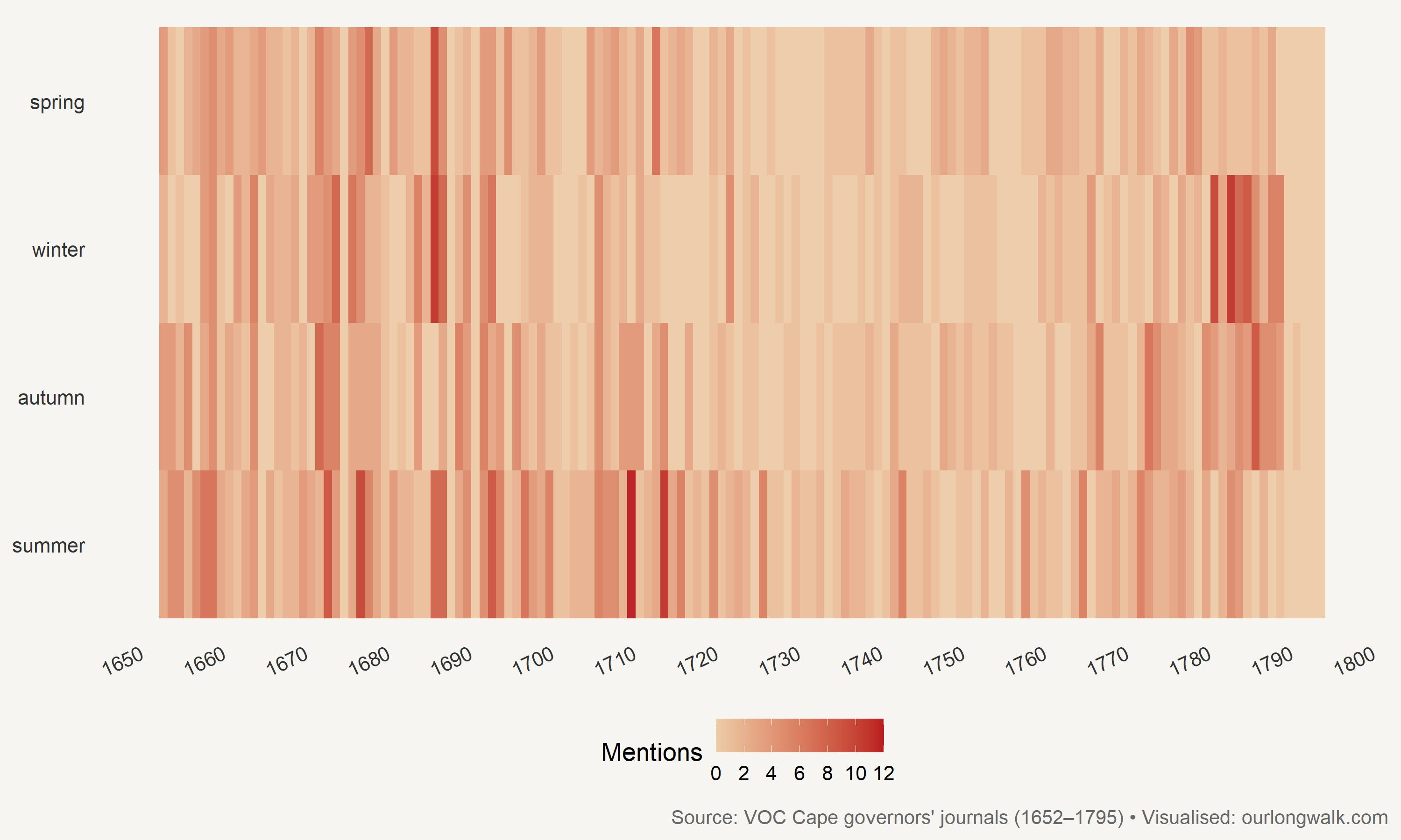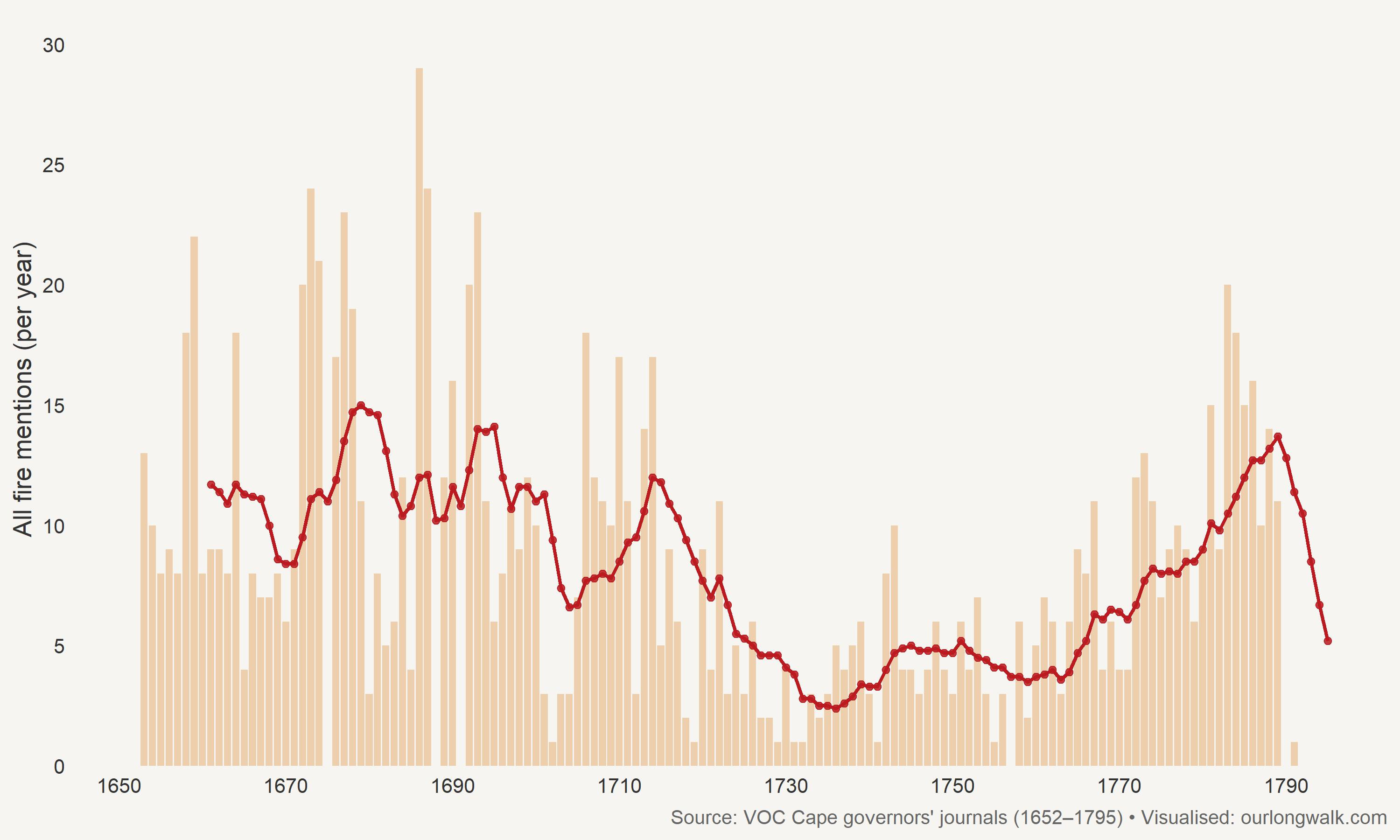 Seasonality is where the record becomes most interesting. Summer dominates, as one would expect in the Cape. But the winter spike in the 1780s is striking. That deserves a closer look: it might reflect an unusual run of conditions; it might reflect a shift in what officials chose to record; it might reflect something local, such as patterns of burning linked to grazing and land management.
