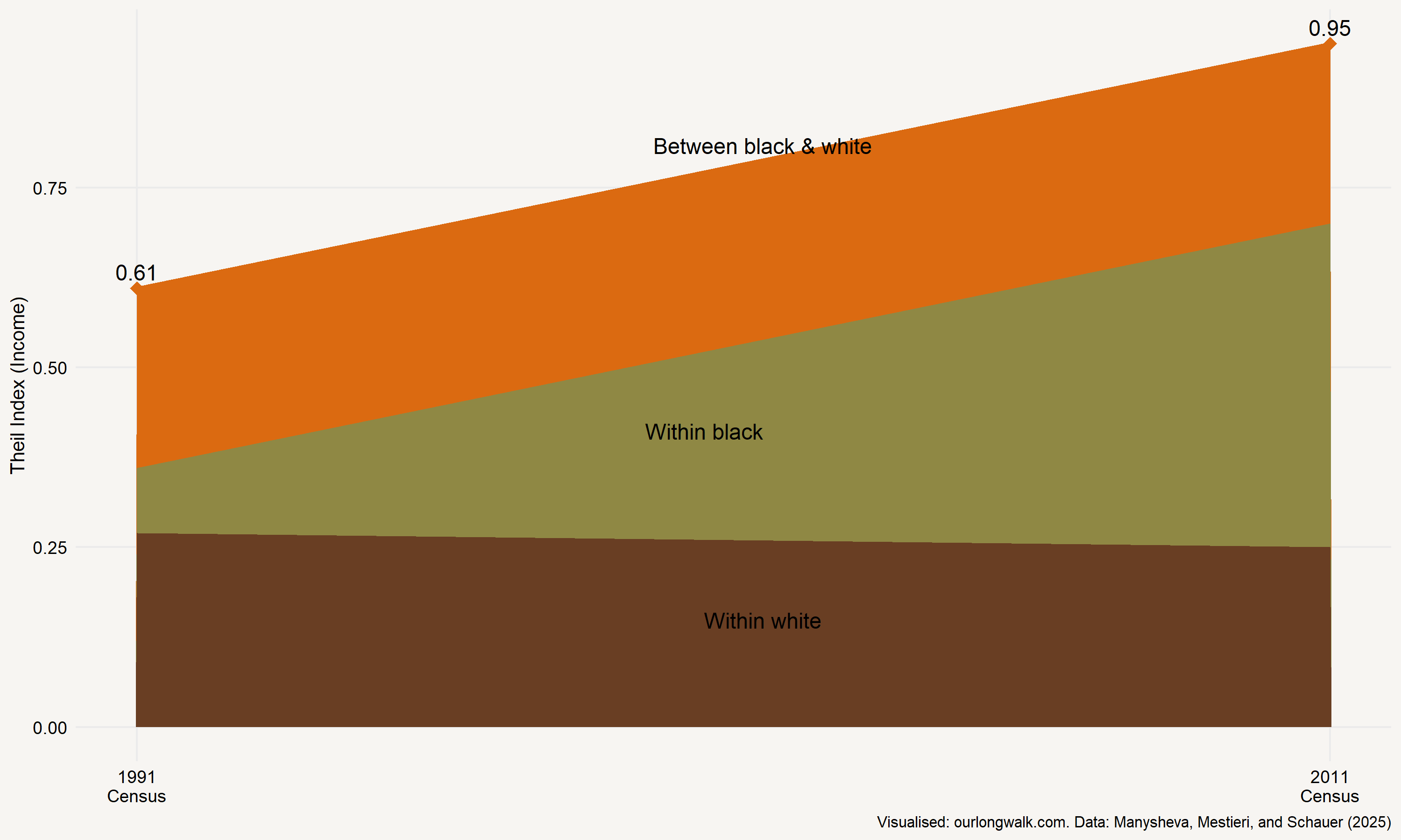 A new working paper by Manysheva, Mestieri, and Schauer documents that within-group inequality among black South Africans has increased sharply since the end of apartheid. By contrast, the gulf between racial groups – the central organising principle of apartheid – is steadily narrowing and is projected to continue shrinking in the years ahead. In practical terms, as shown in the graph below, if every white South African left tomorrow, the Gini coefficient would look much as it did at the end of apartheid. Sachs ignores this transformation entirely.