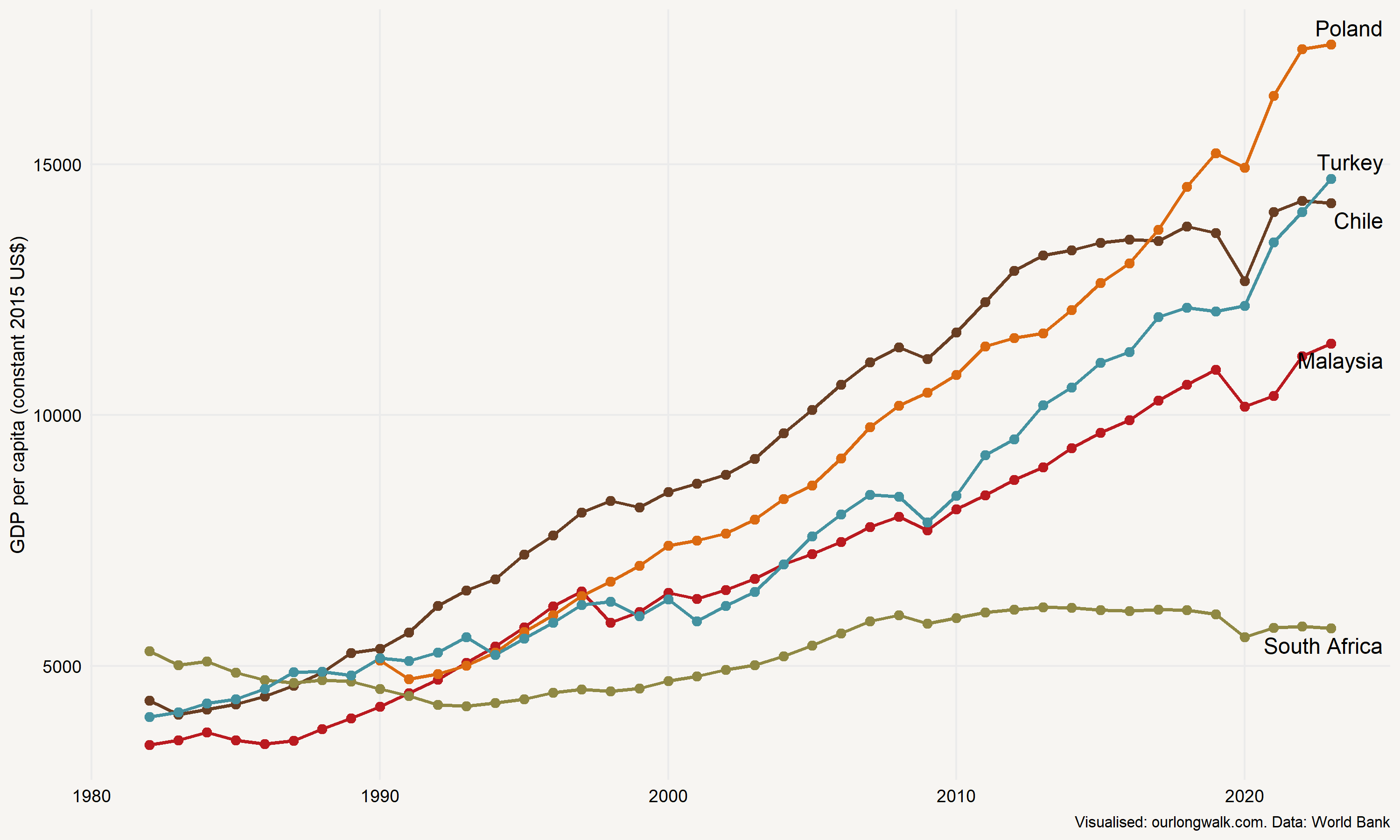 What does Sachs offer as evidence? He leans heavily on an argument that successful growth requires an even initial distribution of productive assets and human capital. But this does not stand up to historical scrutiny. For one, economic growth does not require a society to be perfectly equal at the start. Consider the record: Chile, Poland, Turkey, and Malaysia, all countries that suffered deep historical traumas, high Gini coefficients, even periods of brutal autocracy. All managed to grow rapidly and deliver better lives for millions. Look at the chart: in 1982, the year I was born, all these countries were poorer than South Africa. But since then, and especially since 2010, they have pulled ahead. The gap between them and South Africa today is tragic because it is avoidable.