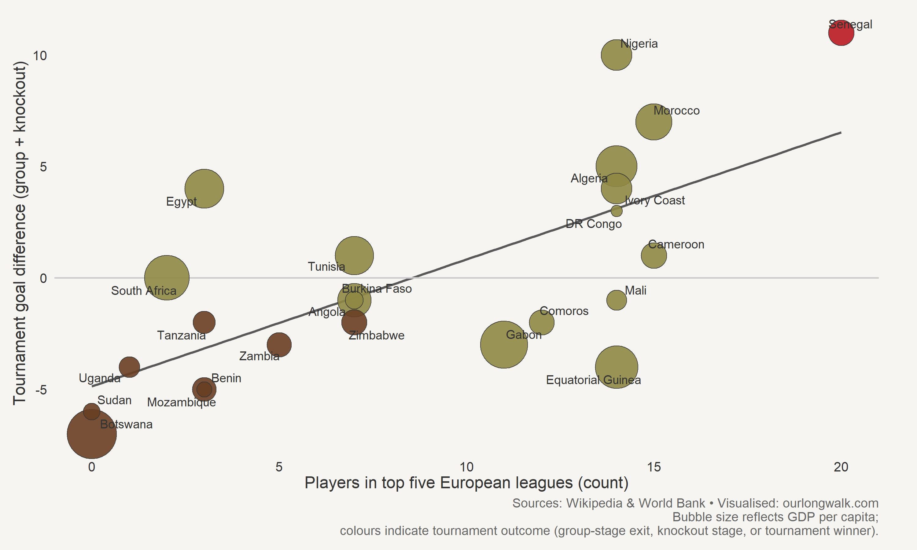 Along the horizontal axis is a simple count: how many players in each Afcon squad earn their living in one of Europe’s “Big Five” leagues (England, Spain, Germany, Italy and France). Along the vertical axis is an equally blunt performance measure: goal difference across the tournament, group stage plus knockouts. The relationship is positive. Teams with more Big-Five-based players tended, on average, to outscore their opponents by more. Roughly speaking, adding two such players is associated with about one extra net goal across the tournament. There are exceptions – Egypt, with a strong local league, can do a lot with relatively few Europe-based players – but no team with fewer than eight Big-Five players reached the knockout stages.