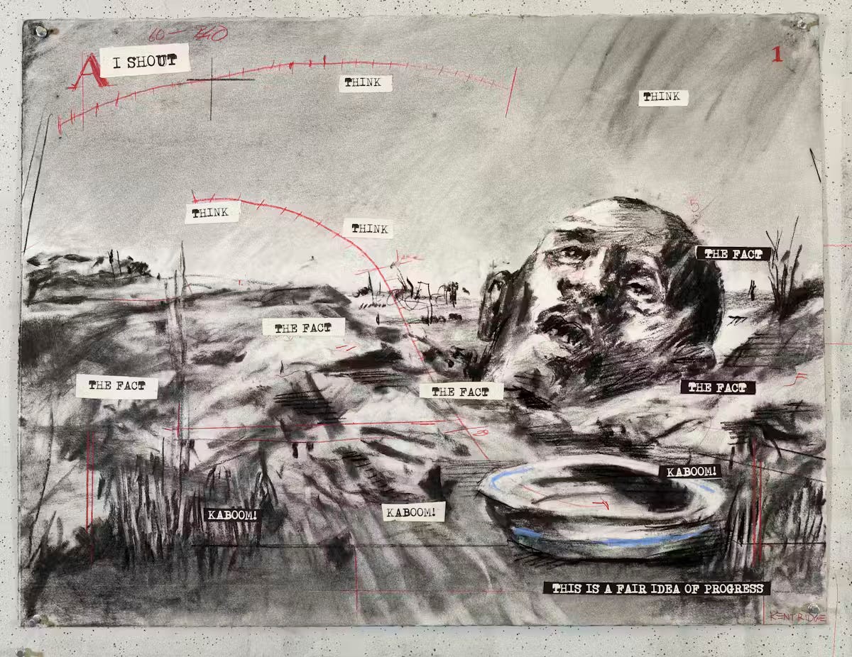 In a charcoal drawing by William Kentridge, a devastated landscape stretches under a sullen sky. The ruins of war are sketched in smeared greys and blacks; amid the wreckage, a severed head – borrowed from Géricault’s Guillotined Heads – looms as a grotesque monument. Scrawled across the scene are the words “This is a Fair Idea of Progress.” The caption drips with irony. Here “progress” is not growth or innovation but destruction. Kentridge, whose work so often excavates colonial and apartheid histories, underlines the lunacy of triumphalist narratives by showing how easily they mask barbarity. The Kaboom! series from which this drawing comes was created around the centenary of World War I; fittingly, it exposes the war’s forgotten African victims and mocks Europe’s pretensions of a civilising mission.