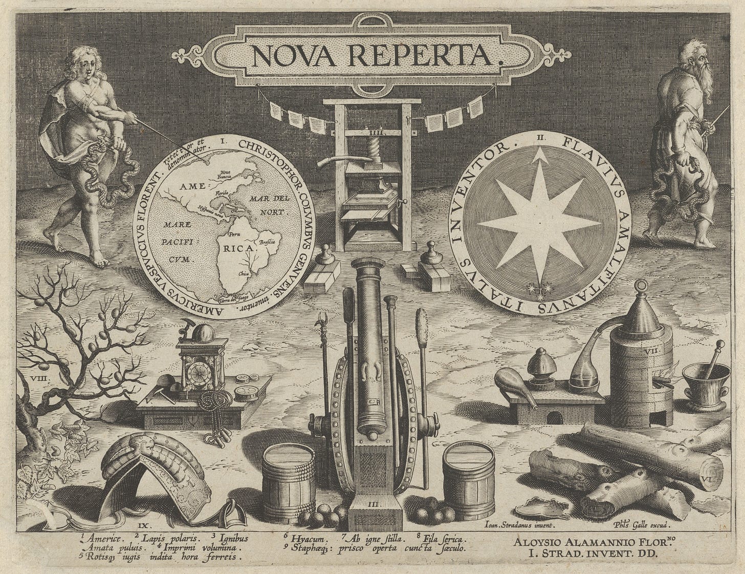 Previous centuries, by contrast, were “cluttered up” with utopias. Not all utopian visions translated benignly into reality, but the act of imagining progress helped expand what societies believed to be possible and provided cultural fuel for material advancement. A striking historical example comes from an unlikely source: a series of engravings published in 1588. Virginia Postrel highlights the Renaissance book Nova Reperta as an early celebration of human advancement. It contains nineteen engravings, each showcasing a relatively recent invention or discovery – the magnetic compass, the printing press, the harnessing of wind and waterpower, and more. These images collectively “made the argument for progress by showing rather than telling.”