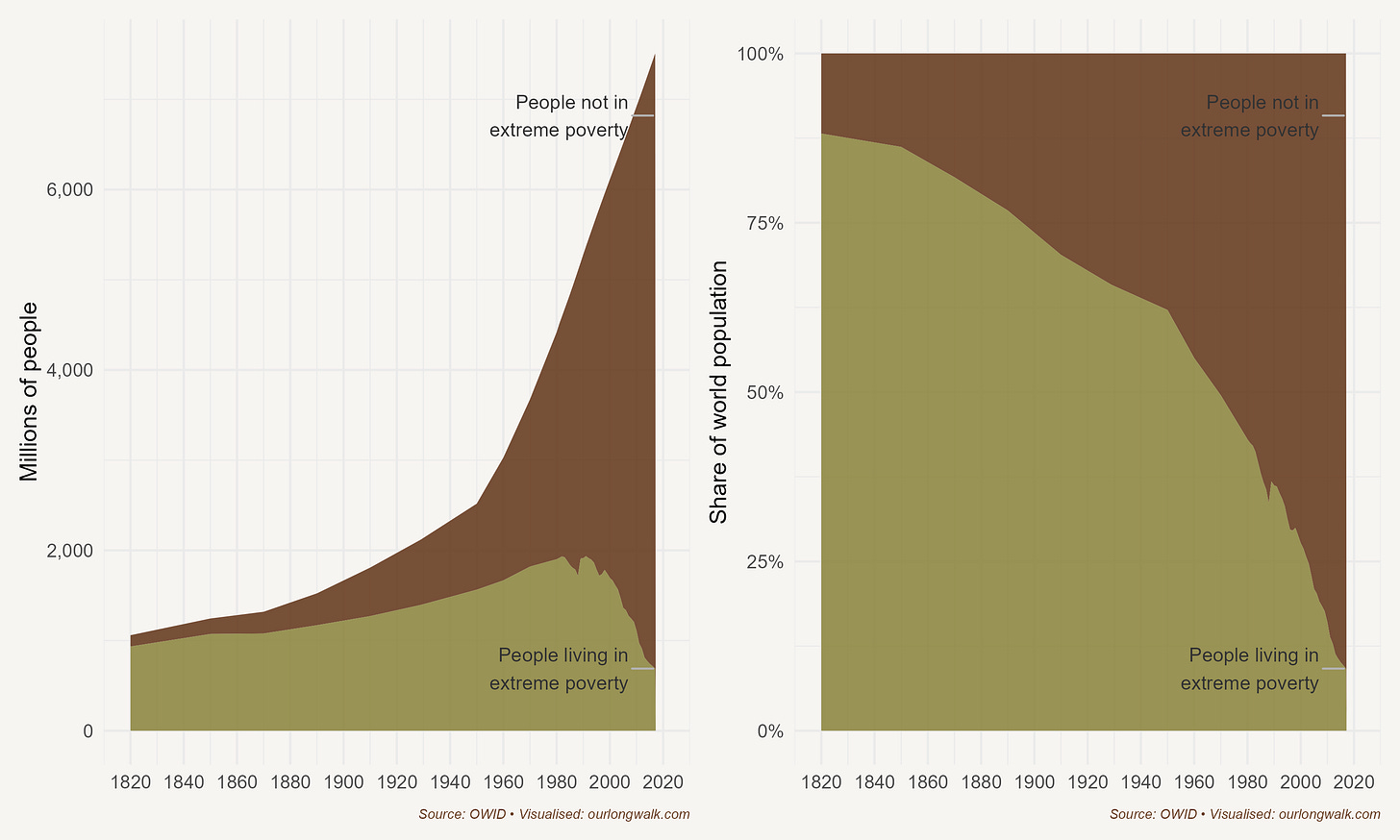 Modern market economies have done something quite different. They have generated the first sustained escape from mass destitution in human history. As the figure above shows, drawn from Our World in Data, the share of the world’s population living in extreme poverty has fallen from well over 80% around 1800 to roughly 10% by 2015. That change has been driven by productivity growth, trade, urbanisation and the spread of technology, combined with states that, at their best, invest in health, education and infrastructure. Inequality has not disappeared; indeed in many places it has risen. But the poor are, on average, far less poor, and the ladders available to climb are far more numerous.