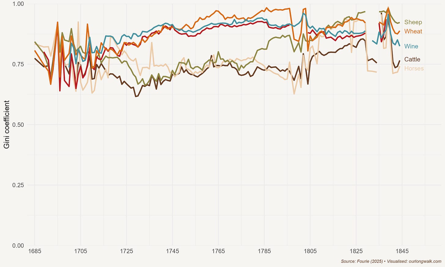 The same pattern emerges from a very different source. The probate inventories – essentially estate files for thousands of deceased settlers – show Ginis for cattle, sheep, wagons and ploughs exceeding 0.6, and after 1770 often above 0.7. You do not need very sophisticated econometrics to see the picture: even within the settler population, a small fraction owns most of the productive capital.