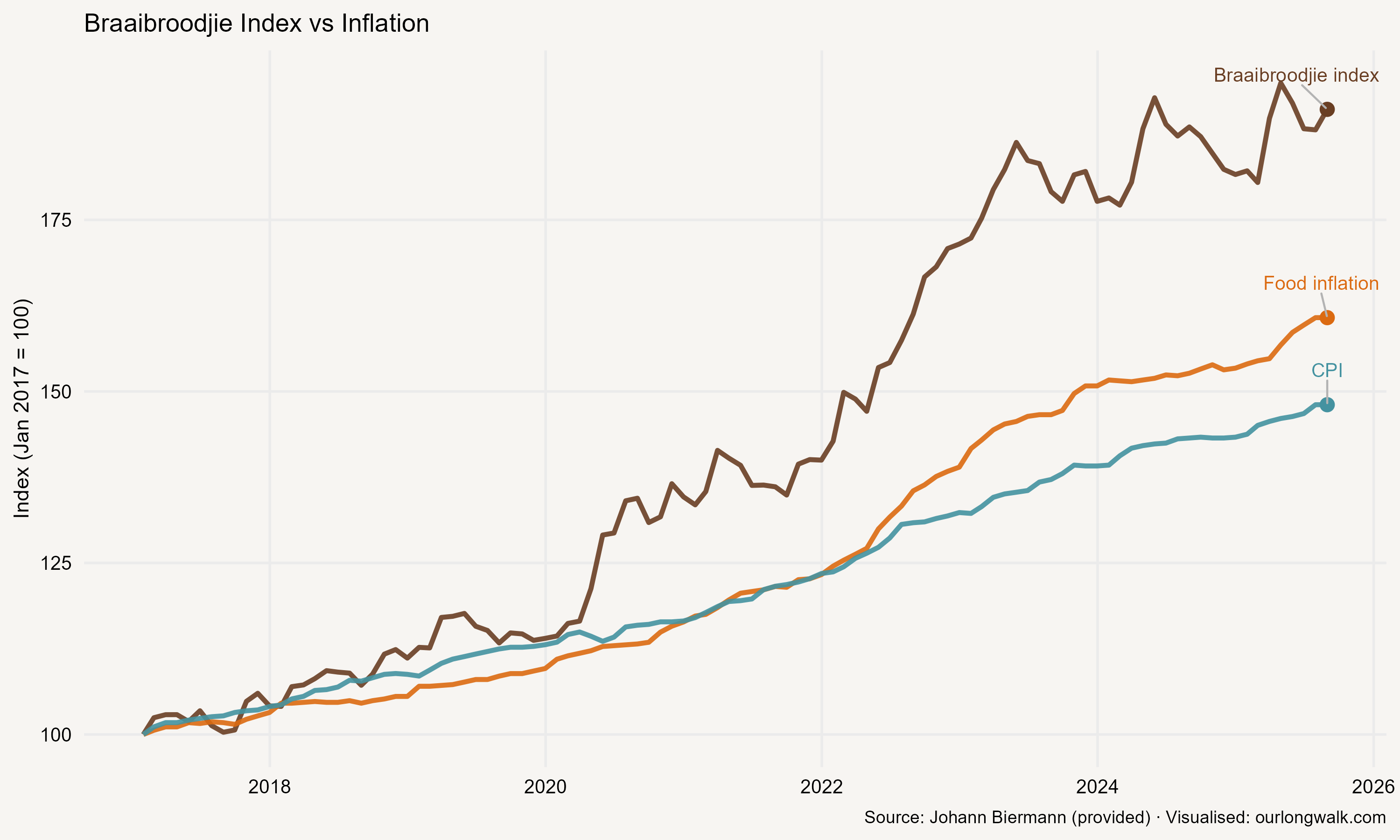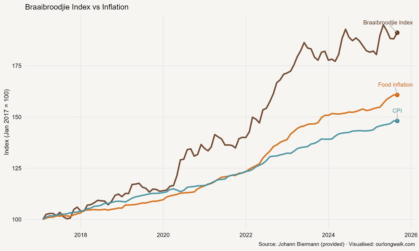 If policy must meet people where they are, it must also recognise that they are not all in the same place. Inflation’s burden is unevenly shared. When food, fuel and administered prices lead the cycle, poorer households, who spend a much larger share of their budgets on those items, face an effective inflation rate above the headline. That inflation inequality erodes real wages fastest where buffers are thinnest and can weaken support for the anchor. Government should therefore communicate in terms people recognise. Johann Biermann’s braaibroodjie index is a useful example: the cost of bread, cheese, tomato, onion and chutney has risen faster than both food inflation and headline CPI since 2017 (see the figure). Tracking such everyday baskets against the target helps people judge whether the prices that matter to them are moving in line with the anchor.