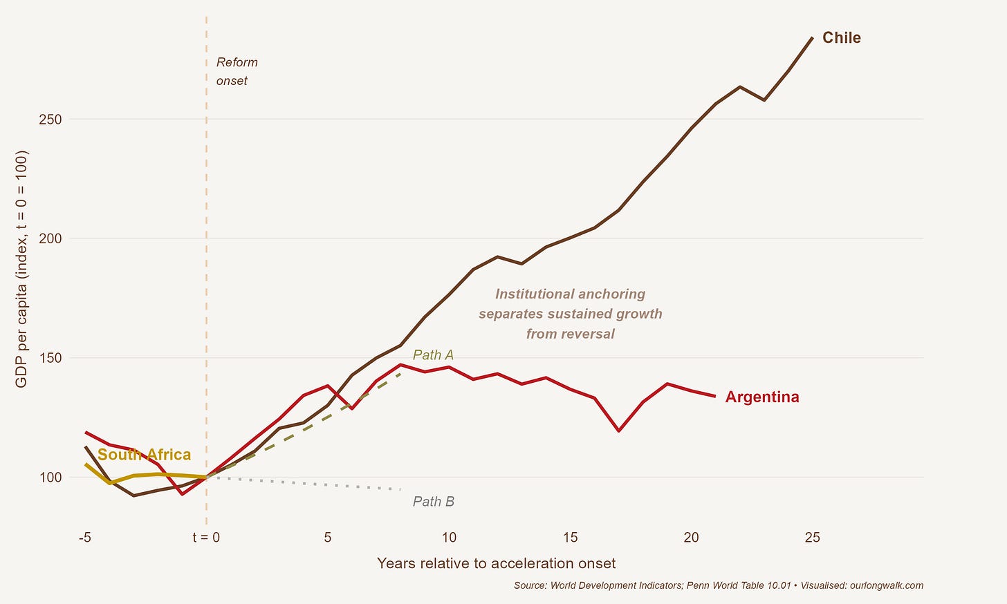 The figure below shows the fork. Chile sustained its growth for two decades; Argentina reversed. South Africa is right there, at the point where the paths diverge.