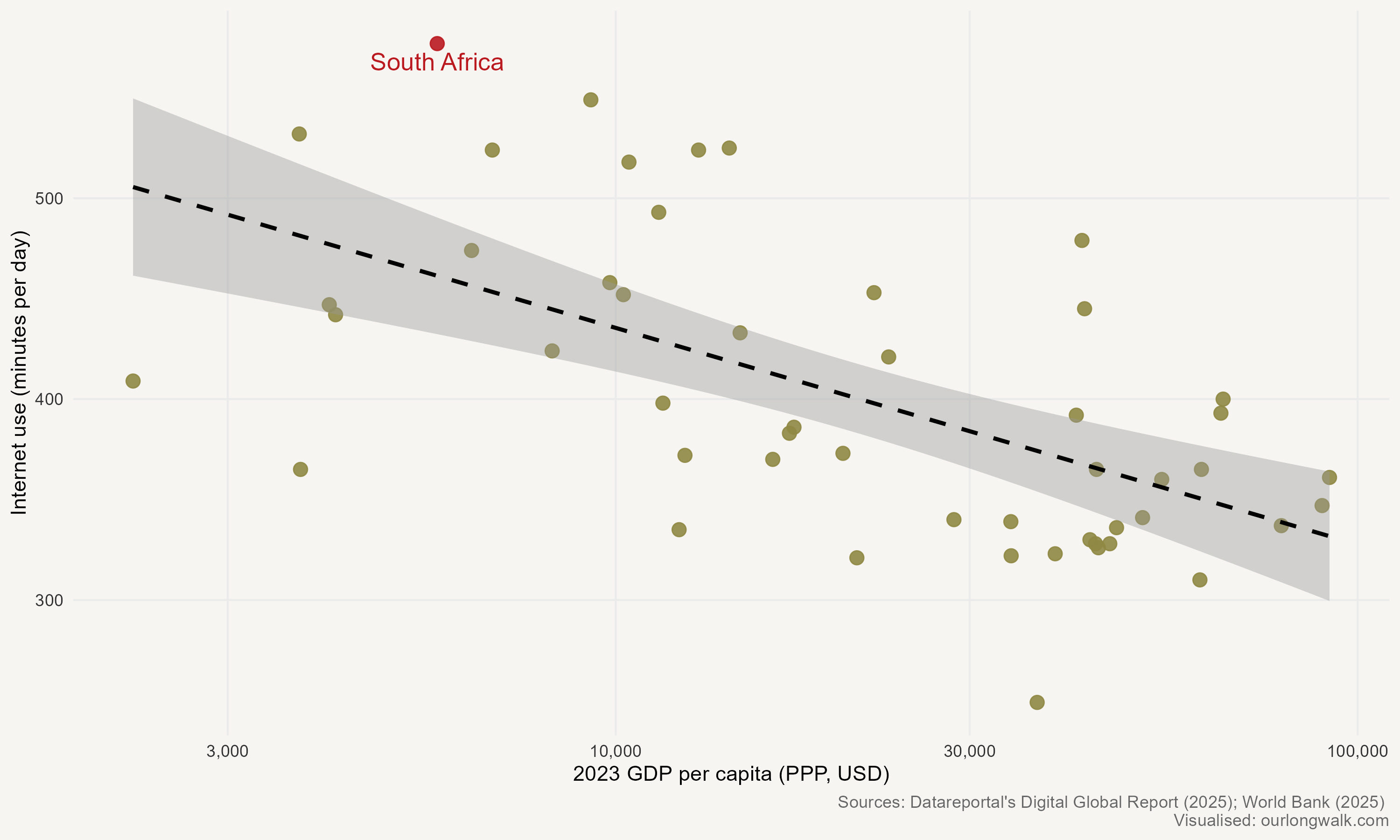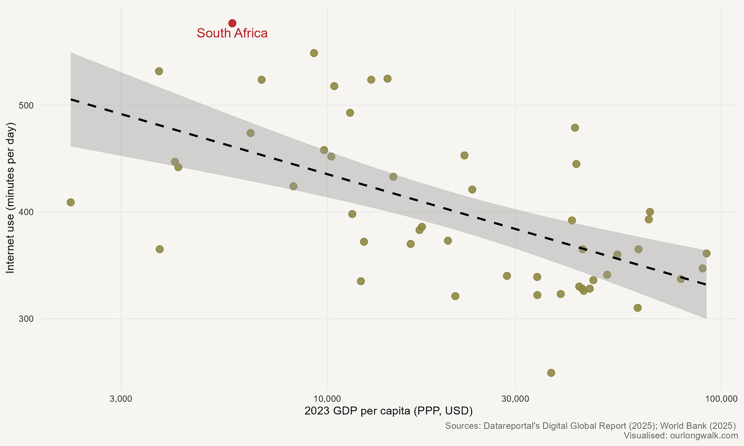 South Africa provides an instructive case. The country is a global outlier in both internet usage and unemployment. The graph above maps daily internet use against GDP per capita. South Africa sits far above the trend line; we spend almost ten hours a day online, significantly more than what income alone would predict. I would argue that this is not evidence of leisure or digital affluence but rather of structural boredom. With youth unemployment above 50% and many communities lacking safe and affordable recreational spaces, the smartphone becomes a lifeline. And it’s not just the young. A friend tells me that his grandmother, now in her eighties and still on the farm, spends her days on her phone. If the battery dies or the connection drops, she feels isolated and adrift. Her story would be familiar to the Moroccan villager.