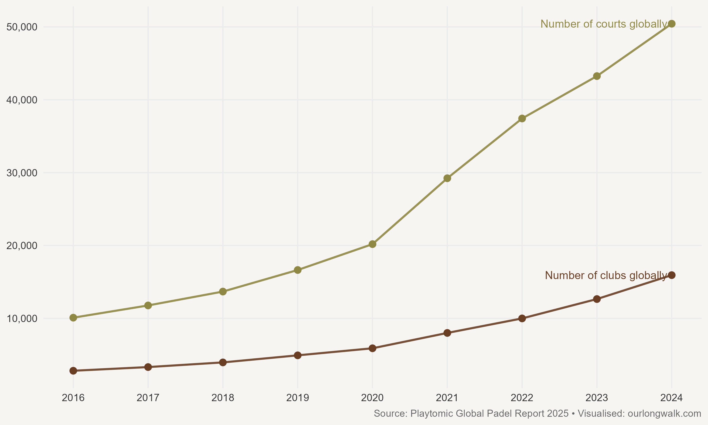 The figure below shows that the number of padel courts globally has doubled in the last four years.