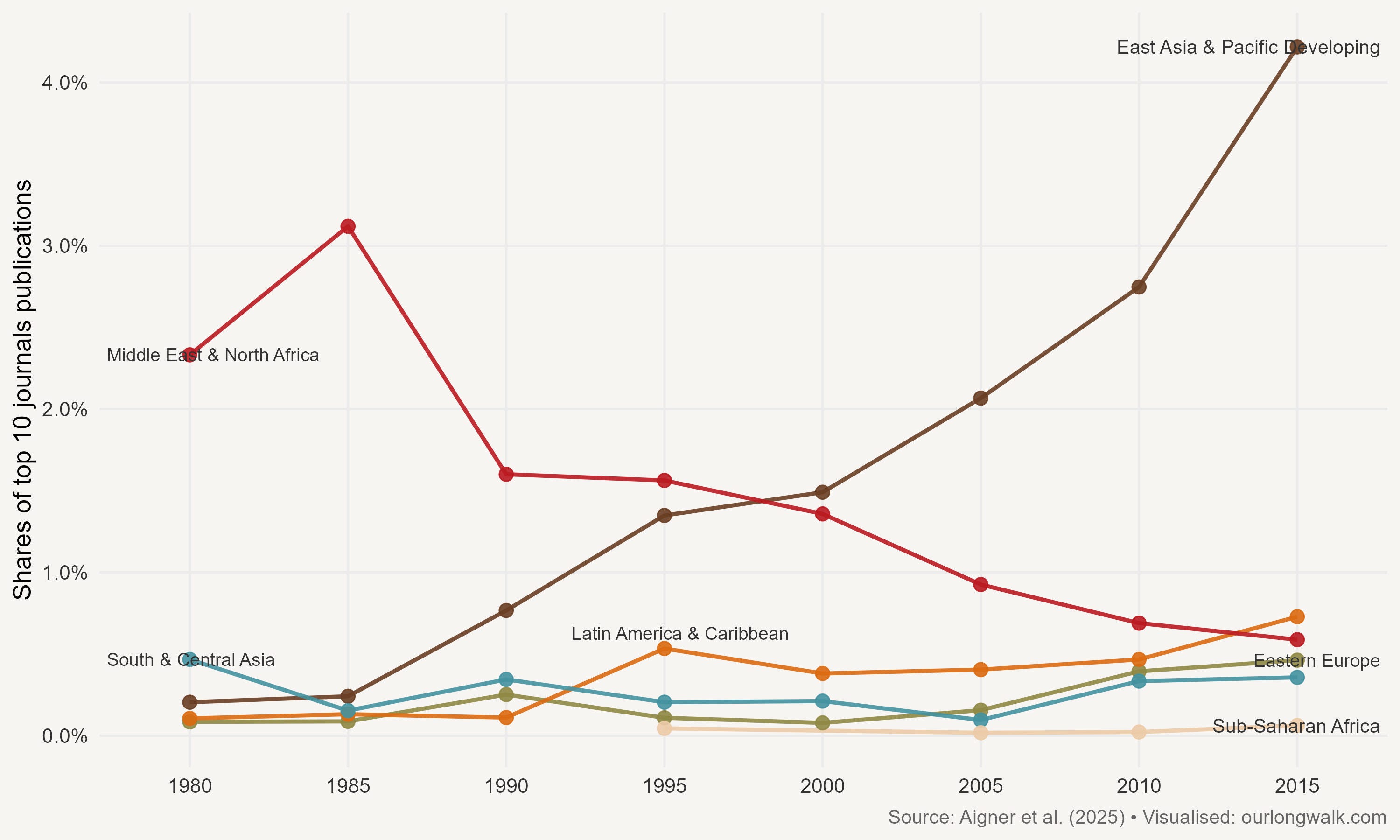 The figure I reproduce here shows the share of articles in the top ten economics journals written by authors based in different developing regions. One line jumps out: East Asia and the Pacific. From almost nothing in the 1980s it has risen to around four per cent of top-ten authorship in recent years. Other regions barely register. Latin America bobs along close to one per cent. South and Central Asia creeps up from almost zero to not much more. Sub-Saharan Africa is a thin, flat yellow line on the x-axis.