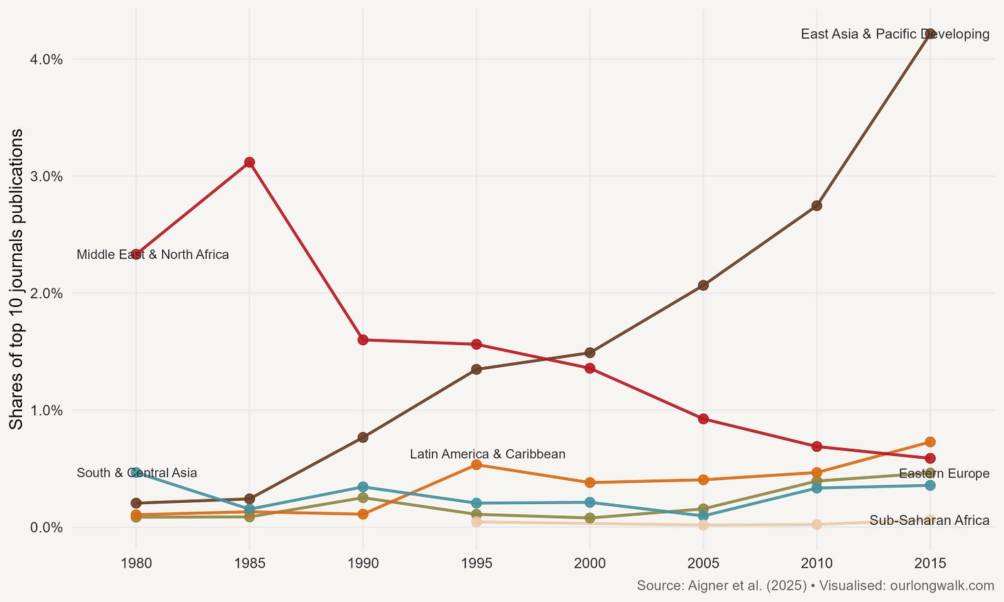 The good news is that change is possible. The same figure that depresses us about Africa gives us a hopeful example in East Asia. Look at the purple line. From the mid-1990s onward, authors based in East Asia and the Pacific steadily increase their share of top-ten publications. China is the main driver. What did they do? They sent thousands of students to study economics in the United States. They still do. Many stayed on in American universities. Many more returned and began to emulate the practices of their professors. They built seminar cultures. They rewarded publication in good journals. They hired internationally. Today it is not at all fanciful to imagine a Chinese economics department breaking into the global top ten. The race is still uneven, but they are at least on the same track.