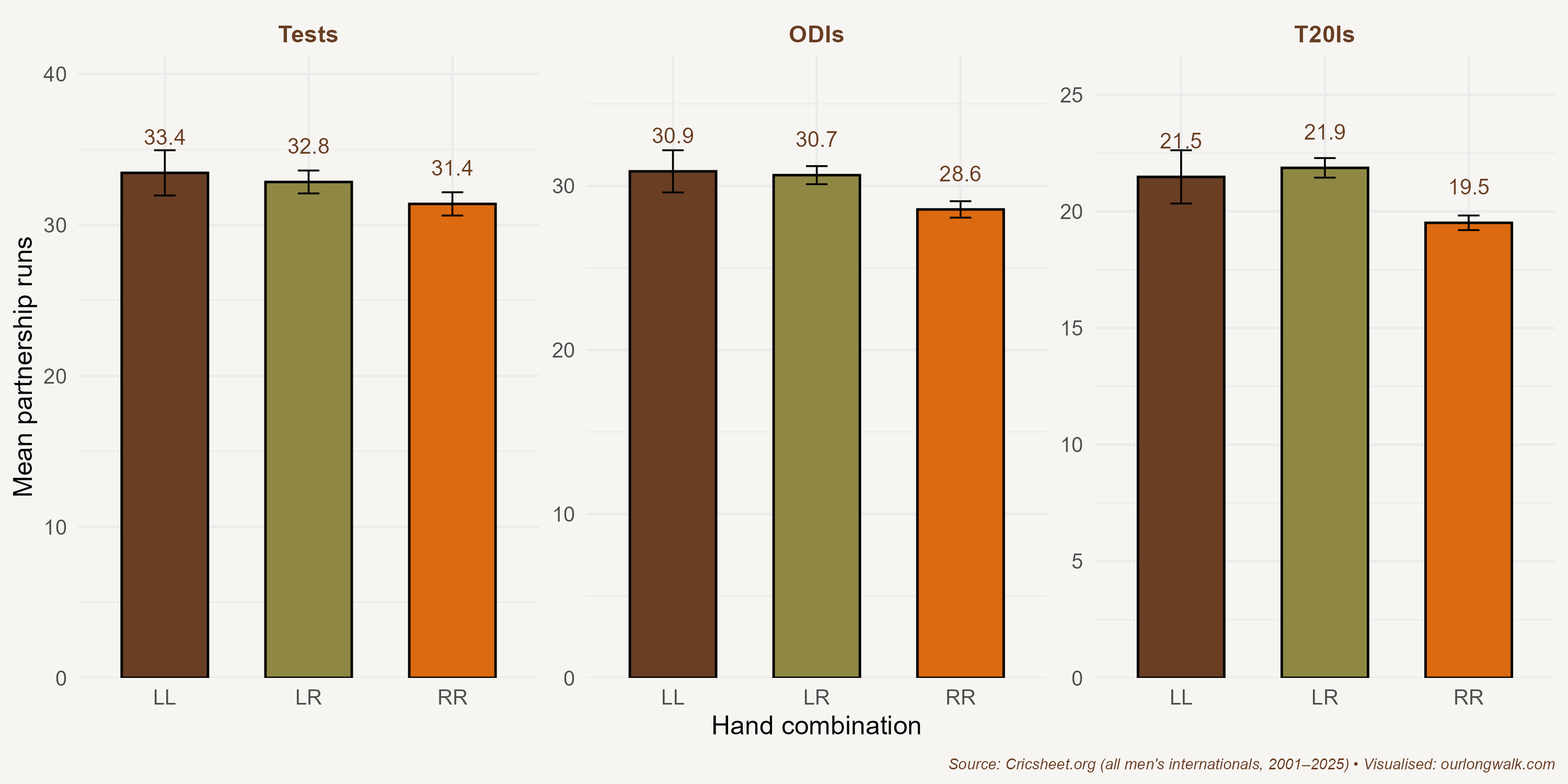 Take a look at the first graph. It shows mean partnership runs by hand combination across all three formats. The pattern is striking, but not in the way you might expect. The ordering is LL (both left-handed) greater than LR (mixed) greater than RR (both right-handed). If the switching-cost theory were correct, mixed partnerships should outperform both same-hand types. They do not. Instead, the more left-handers in a partnership, the higher the score. The pattern points to left-hander quality, not left-right hand complementarity.
