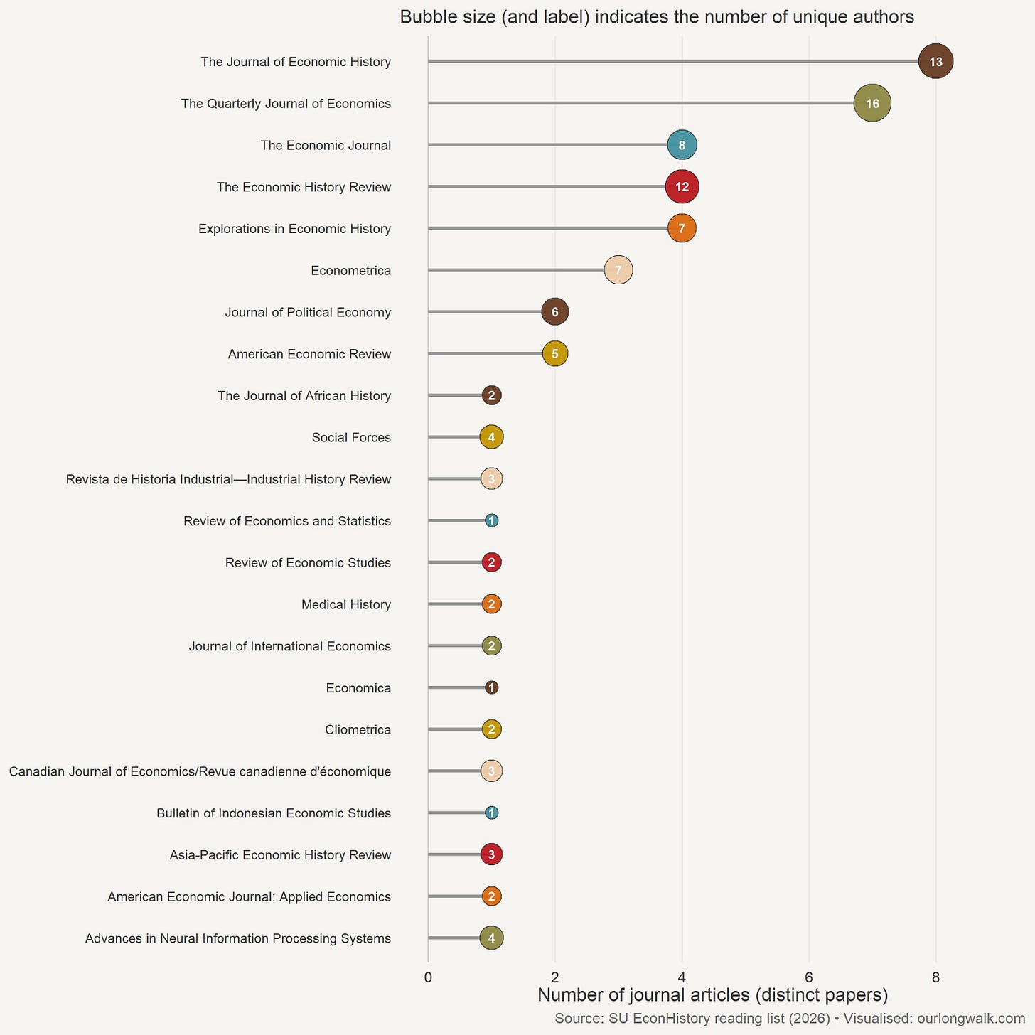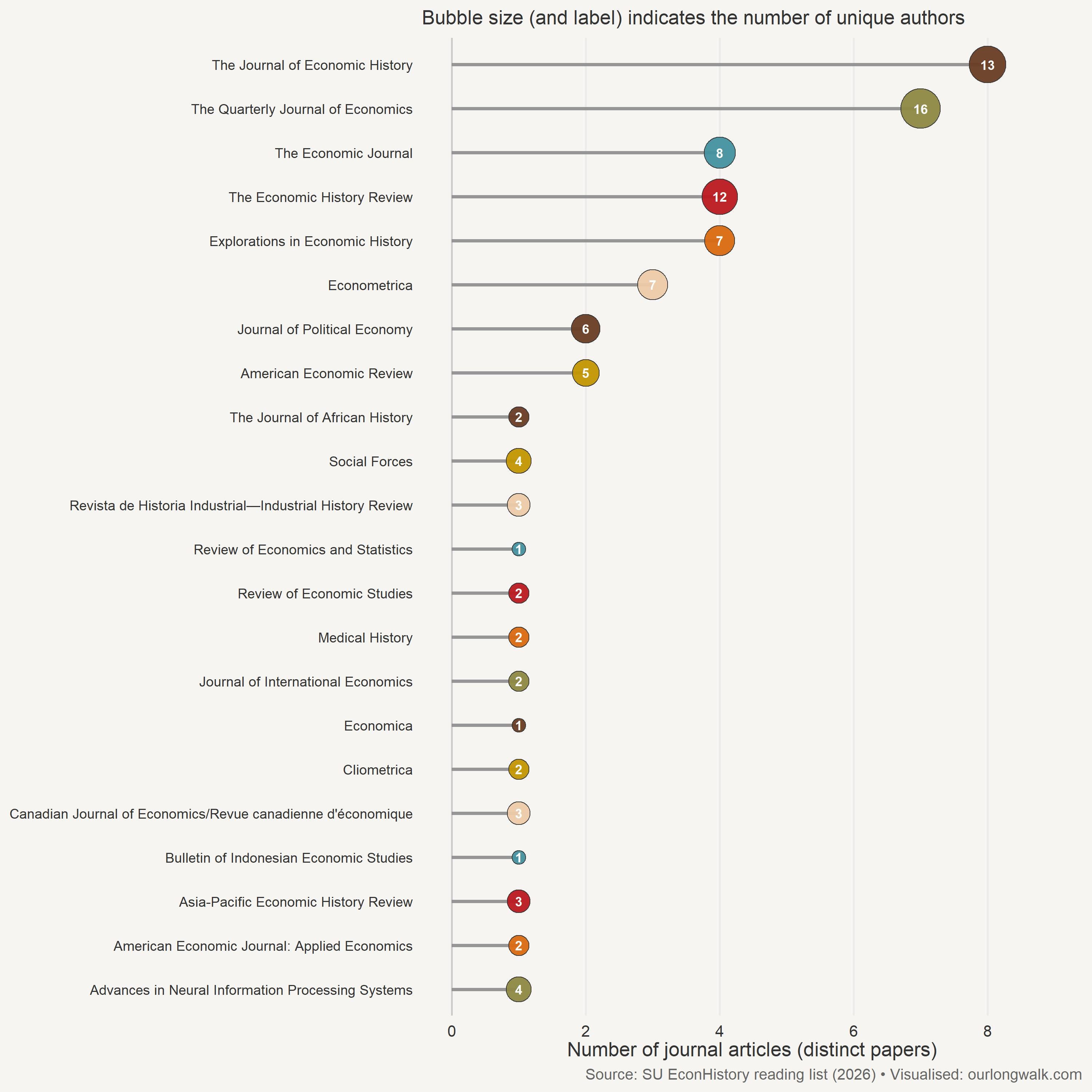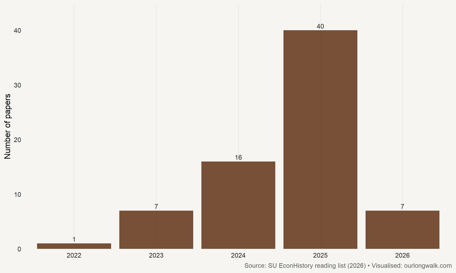 In total, there are 72 papers on the list, with 182 unique authors. (The list of authors is much longer than in previous years, because of the inclusion of this paper.) As the image above shows, I have a strong preference for recently published papers; I don’t think that recent necessarily means the best, but this preference does two things: it forces me to stay up to date with what is new in the field, and it shows students that economic history is, well, not history.