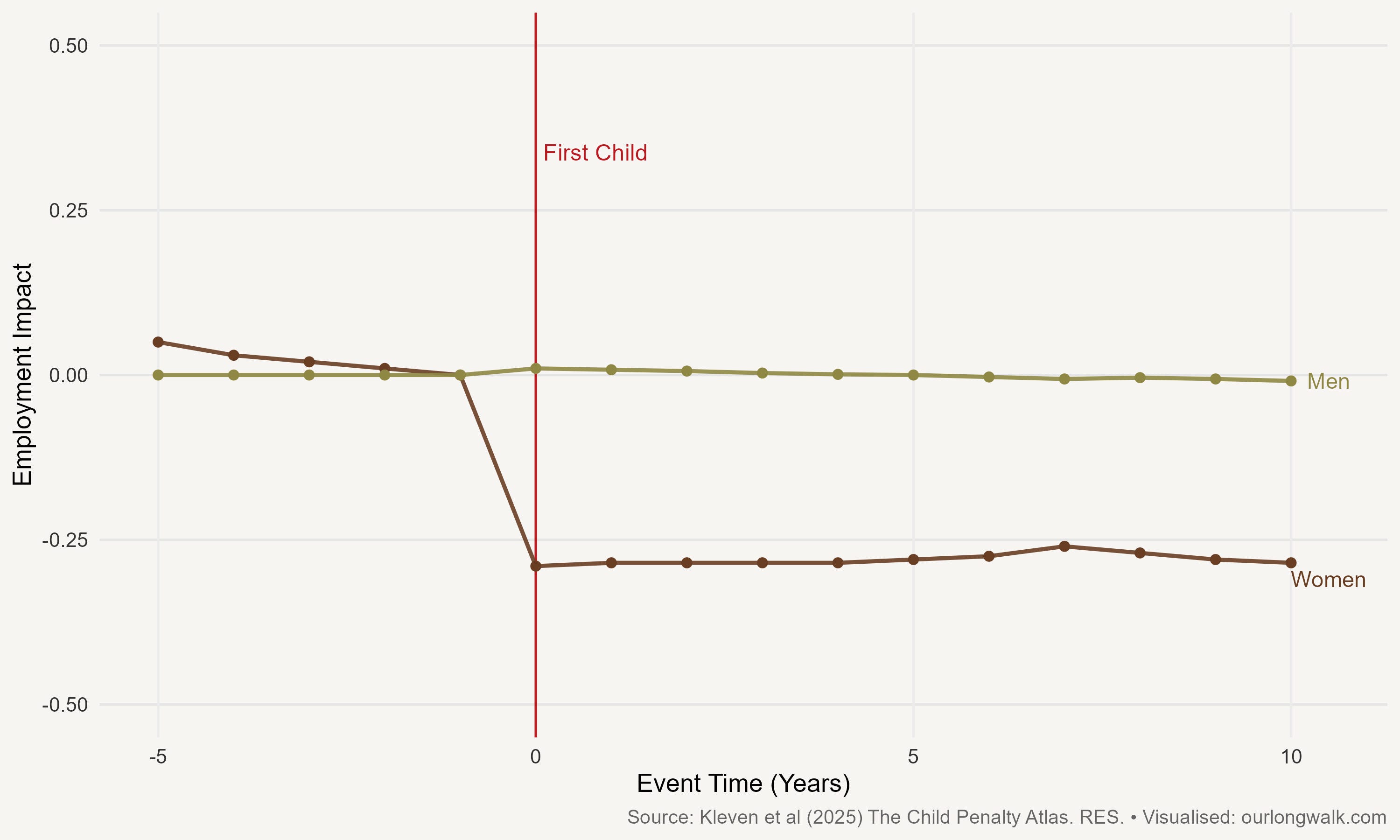 Economists have a term for this kind of unintended outcome: the child penalty. It refers to the decline in women’s earnings and employment relative to men’s after the birth of their first child. A new global study by Henrik Kleven and co-authors, The Child Penalty Atlas (2025), maps this phenomenon across 134 countries. The results show that in almost every country, men and women follow parallel career paths until parenthood, then diverge sharply and permanently once children arrive. And South Africa stands out: our child penalty, as the figure shows, is around 28 percent, among the highest in Africa and globally. That means that, relative to men, South African women’s employment falls by roughly a quarter after having a child, and it never fully recovers.