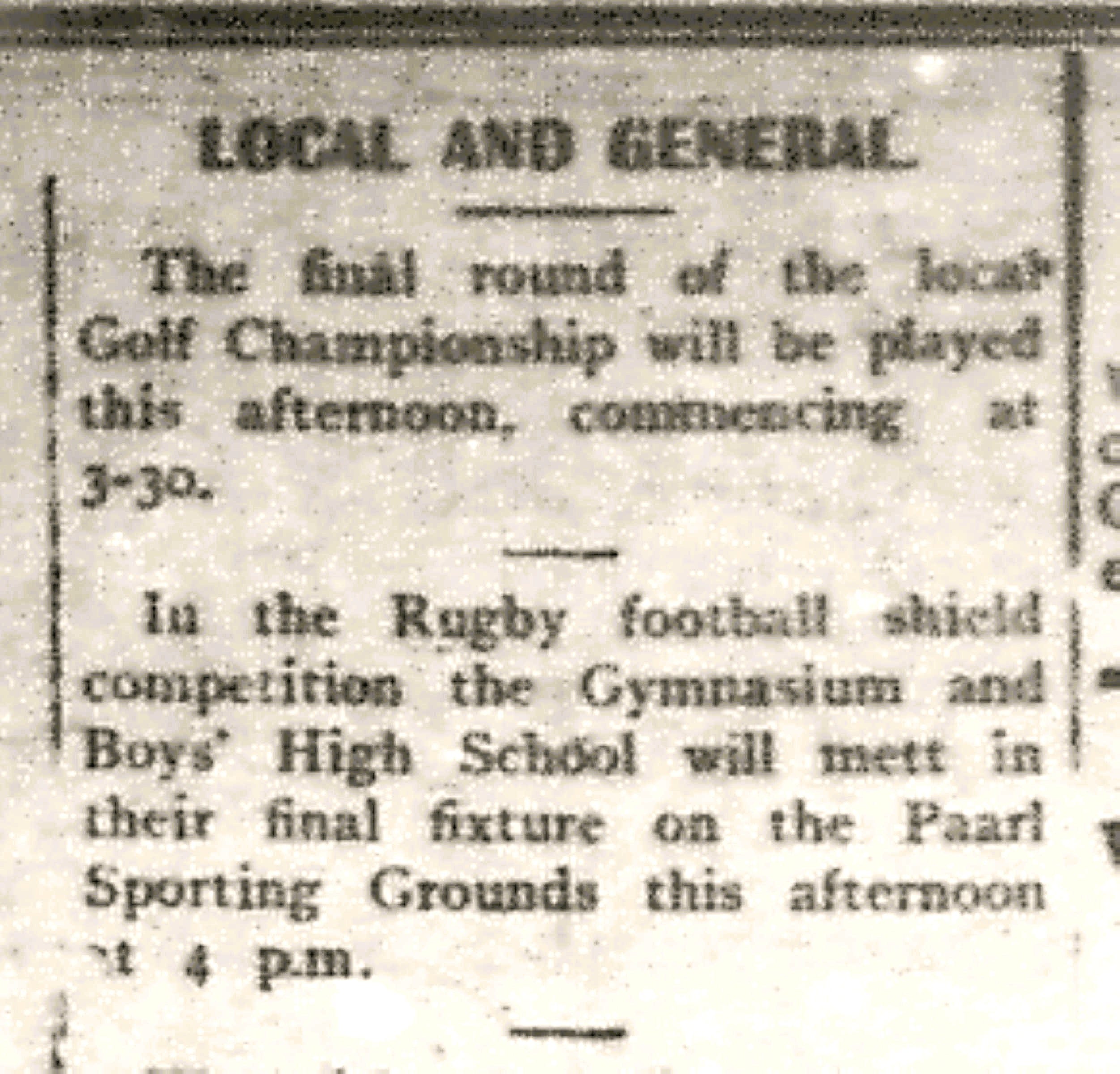It wasn’t always like that. The first interschools match, played in 1915, received little attention. A short notice in the local paper simply announced that the final ‘shield match’ between the two schools would take place at 4pm at the Paarl Sporting Grounds. The world was at war, and most of the news focused on troop collections and the arrival of General Louis Botha, South Africa’s first prime minister, who visited Paarl that August to much fanfare. Sport was still a regular feature in the paper – rugby matches, golf championships, and track events all made the columns – but it was just another item among many. That same month, the paper reported on the handover of fencing equipment from the local police chief to the Paarl Scout Troop, and to celebrate the King’s Birthday, the town organised a sports day on 2 August to raise funds for the Belgian Relief Fund. Events included flat races, team relays, cycling, tug-of-war, basketball, and even a motor cycle and side-car potato race. While troops in Europe fought to a general stalemate, Paarl carried on with its own sporting routines. Rugby was there, but in 1915, it was just another entry in the sports results.