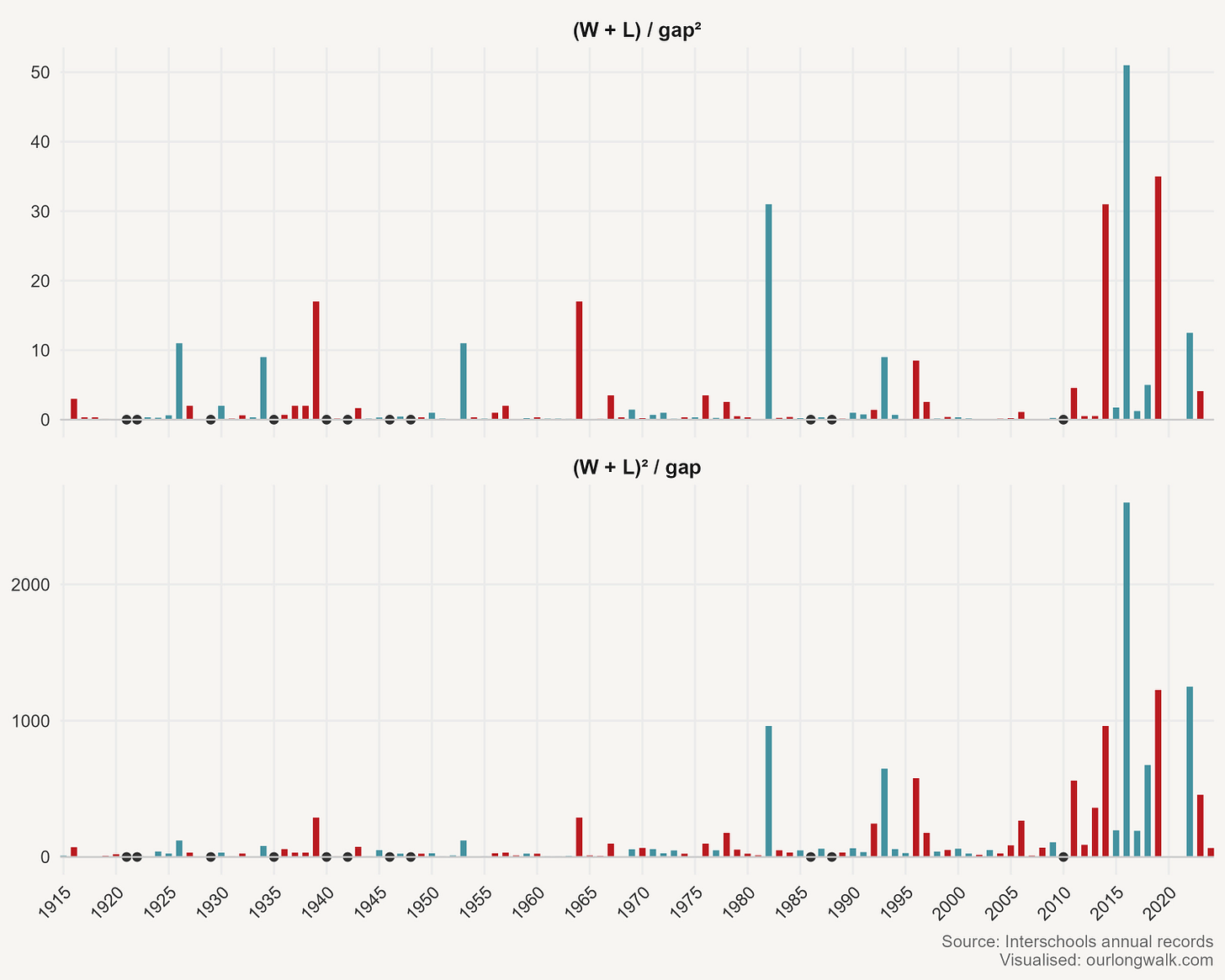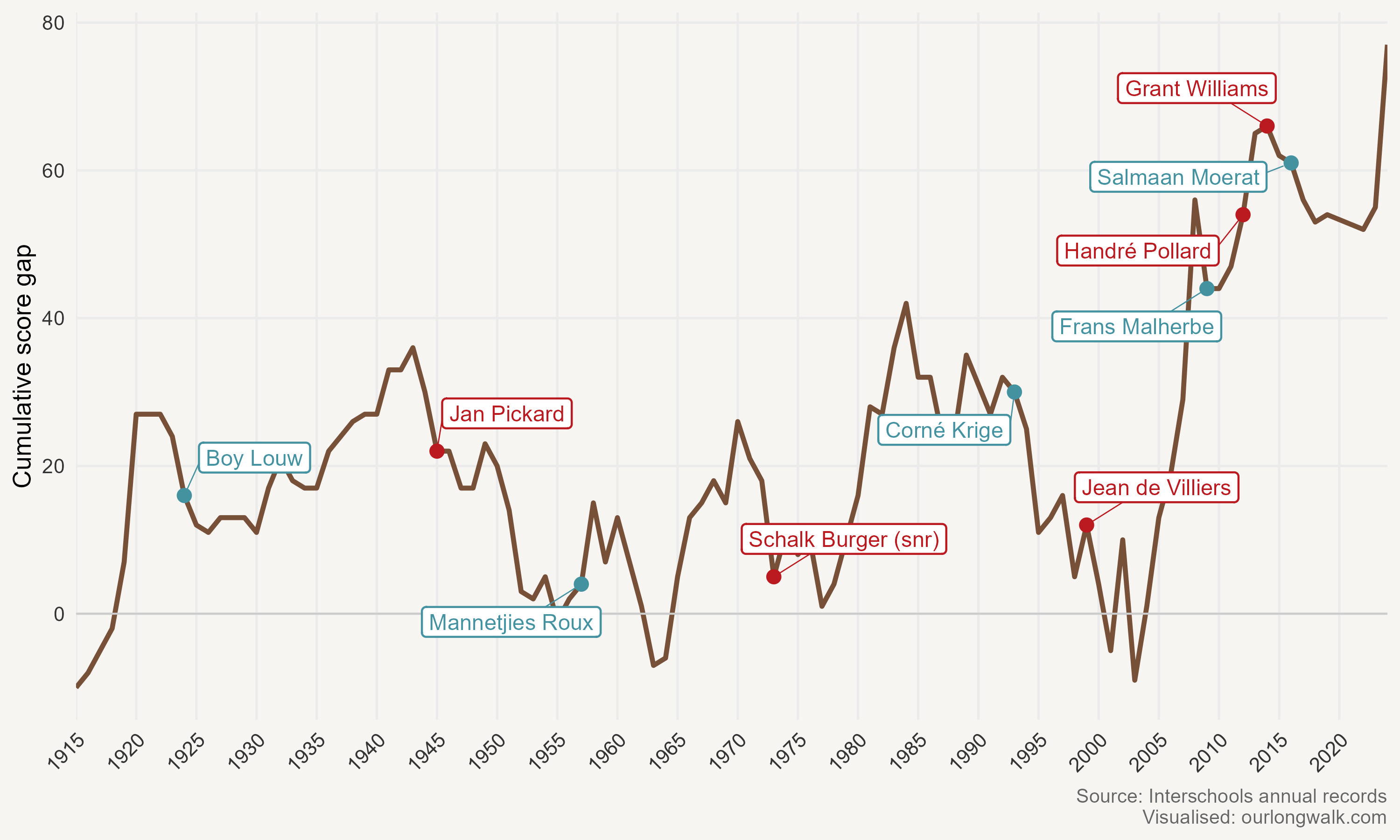 The quality of the players has been matched by the closeness of the contest itself. The figure below tracks the cumulative score gap between the two schools. Each year, the winning margin is added (or subtracted), so if Gim wins by ten, ten points are added to the tally; if Boys’ High wins by five, five are subtracted. When the line is above zero, Gim has outscored Boys’ High over time; below zero, Boys’ High has the advantage. Gim dominated the early decades, building a comfortable lead in total points. That changed in the middle of the twentieth century, when Boys’ High overtook them. The early 1980s saw big wins for Gim, but Boys’ High responded strongly in the 1990s and early 2000s. The late 2000s and early 2010s again swung towards Gim, with some decisive victories. Last year’s result, with a margin of 22 pushed the cumulative total to its highest ever. To bring it back to zero, Boys High would need to score more than 78 unanswered points.